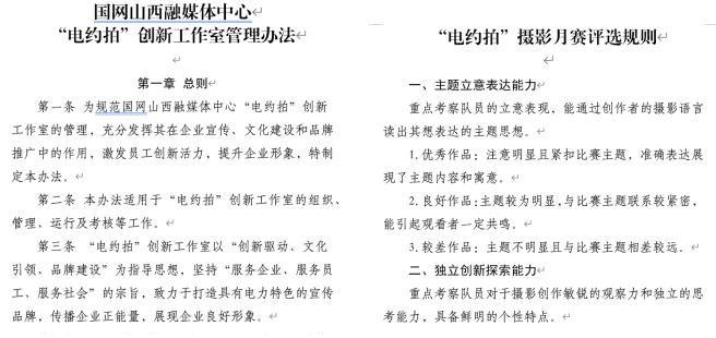 制定《“電約拍”創(chuàng)新工作室管理辦法》《2024年“師帶徒 青藍(lán)計(jì)劃”新聞采訪實(shí)訓(xùn)方案》《圖片資源管理系統(tǒng)管理辦法》《“電約拍”團(tuán)隊(duì)積分獎(jiǎng)勵(lì)辦法》《爭(zhēng)創(chuàng)“七個(gè)最”宣傳成果工作方案》《“為美好生活充電 為美麗中國(guó)賦能”攝影月賽評(píng)選規(guī)則》《“電約拍”采風(fēng)承諾書》等相關(guān)制度,通過完善的管理機(jī)制和制度,推進(jìn)了項(xiàng)目規(guī)范化運(yùn)營(yíng)、標(biāo)準(zhǔn)化管理。加強(qiáng)團(tuán)隊(duì)文化建設(shè),“電約拍——佳片有約”團(tuán)隊(duì)師徒8人,通過附加“葫蘆家族”情愫,打造出“記錄時(shí)代、匠心傳承”的團(tuán)隊(duì)文化。