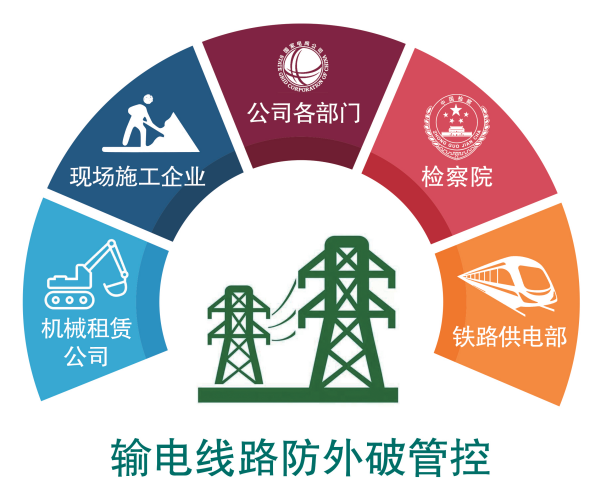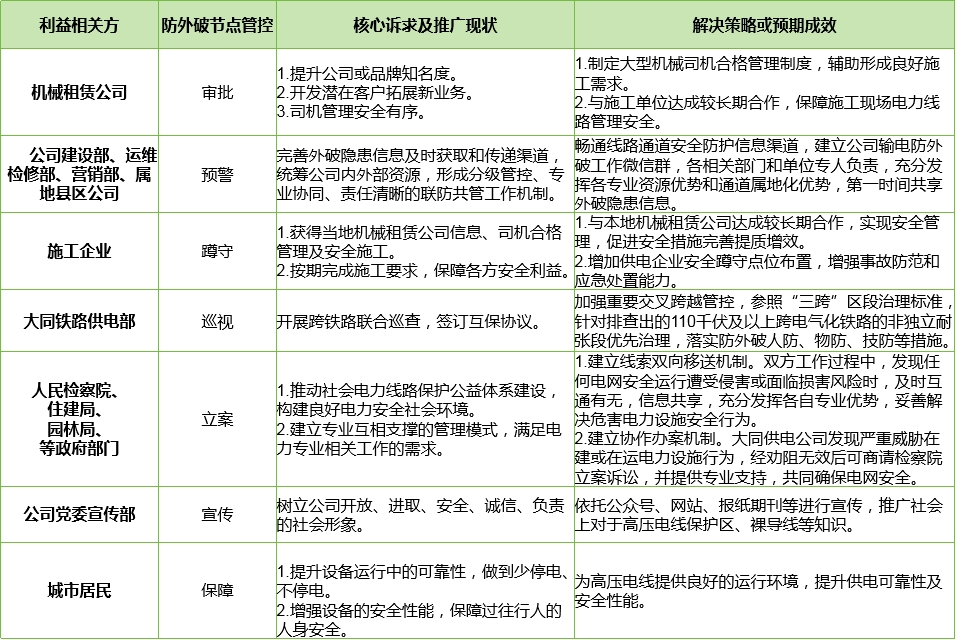 針對利益相關(guān)方的“五力”優(yōu)勢(組織力、決策力、監(jiān)督力、協(xié)作力、影響力),明確核心訴求和責(zé)任邊界,建立大型機械司機合格管理、臨時施工備案信息共享、施工固定點蹲守防護、鐵路安全互保協(xié)議、檢察院公益訴訟等多維度輸電線路防外破治理體系。