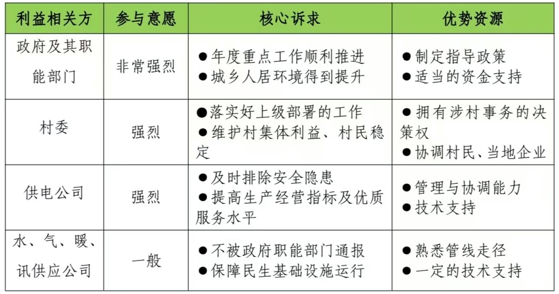 轉(zhuǎn)變以往單打獨斗的固有工作方式,識別農(nóng)村配電規(guī)劃建設有關的利益相關方,分析其訴求、資源優(yōu)勢,充分考慮其合理建議、期望和訴求,找到各方利益相關方的聯(lián)結(jié)點,形成“政府主導、供電公司推動、水氣暖訊企業(yè)協(xié)同配合、客戶受益、多方共贏”的推進模式。