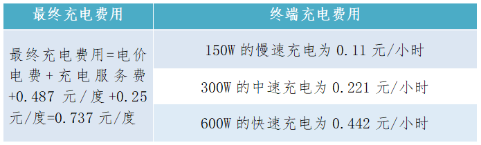 據(jù)市場統(tǒng)計,運營商充電服務(wù)費一般為:0.4-0.6元/度。為進一步降低充電費用,引入充電站廣告商,將廣告租金的60%補貼至充電站運營商,以降低充電服務(wù)費,根據(jù)盈利效益測算,同運營商溝通,可降低充電服務(wù)費至0.12-0.25元/度,按0.25元/度計算最終充電費用如下表所示。